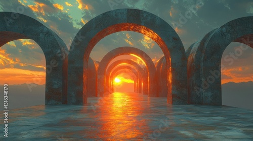 © Agnieszka, Fototapeta premium Sunset over a timeless plateau archways to forgotten eras