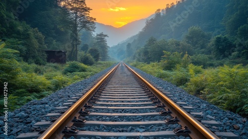 © RONNY, Fototapeta premium Sunset over a train track through a valley