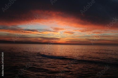 © Wirestock, Fototapeta premium Sunset over a tranquil body of water, with a beach in the foreground