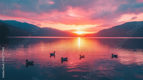 © Terablete, Naklejka premium Sunset over a tranquil lake with ducks swimming peacefully in the serene water landscape