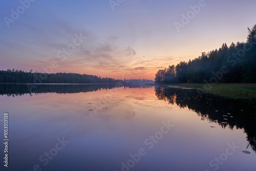 Obraz premium Sunset over a tranquil lake with forest reflections.