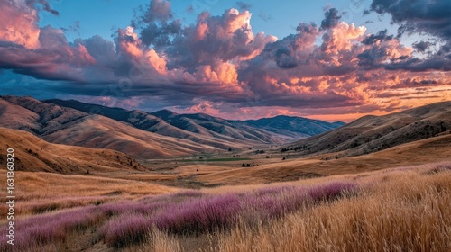 © Mnusia, Fototapeta premium Sunset over a valley with hills and clouds