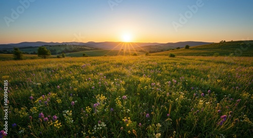 Fototapeta premium Sunset over a vibrant meadow, rolling hills and a clear sky. Golden hour...