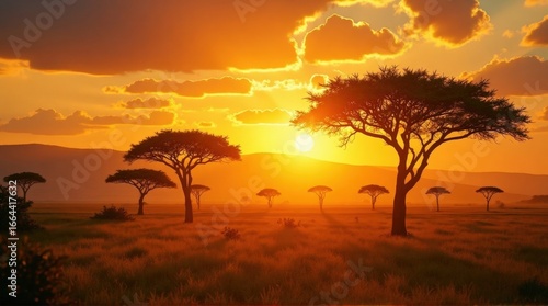 © d-satoro, Obraz premium Sunset Over African Savanna with Silhouetted Acacia Trees and Vibrant Sky