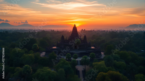 © hwsky, Fototapeta premium Sunset Over an Ancient Temple Surrounded by Jungle