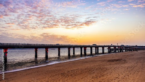 © zhouyilu, Fototapeta premium Sunset Over Beach with Pier Structure