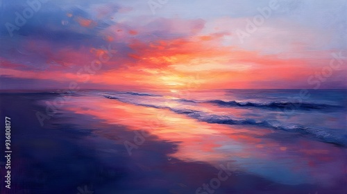 Fototapeta premium Sunset over calm beach, sky aflame with color, soft wave patterns, oil on...