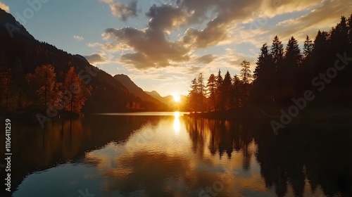 Fototapeta premium Sunset over calm lake reflecting colorful sky and mountains.