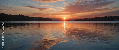 Fototapeta premium Sunset over calm lake water with reflections and colorful clouds in the sky during dusk supporting a tranquil natural landscape scene