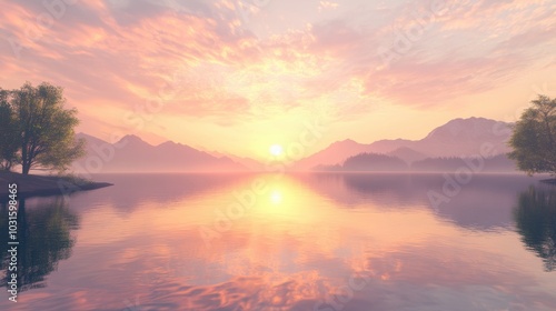 Fototapeta premium Sunset over calm lake with mountains and trees.