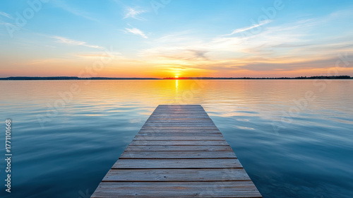 © siraphol, Naklejka premium Sunset over calm lake with serene reflections and warm pastel colors creates tranquil atmosphere