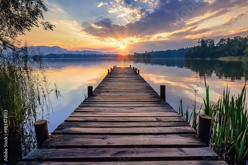 Fototapeta premium Sunset over calm lake with wooden pier, serene and peaceful landscape