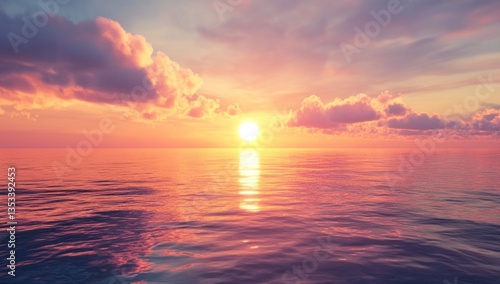 Fototapeta premium Sunset over calm ocean, vibrant clouds reflecting