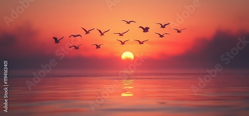 © Design By Reiga, Naklejka premium Sunset over calm ocean with flock of birds flying.