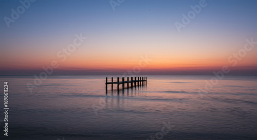 Fototapeta premium Sunset over calm ocean with wooden pier