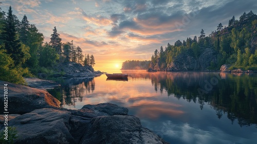 © Zidane, Fototapeta premium Sunset over calm river with pine trees