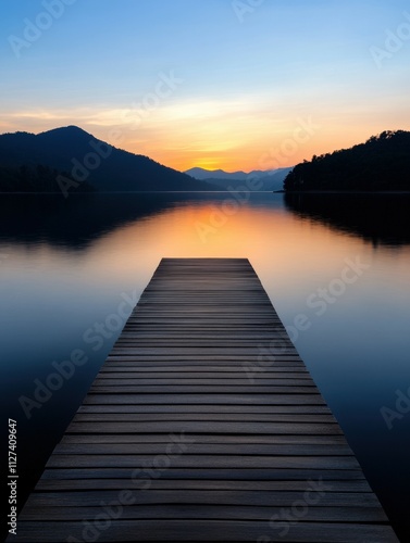 © BrandwayArt, Naklejka premium Sunset over calm water from a wooden dock at a lake