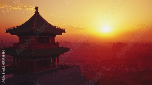 © slamet, Fototapeta premium Sunset over Chinese Cityscape from Pavilion
