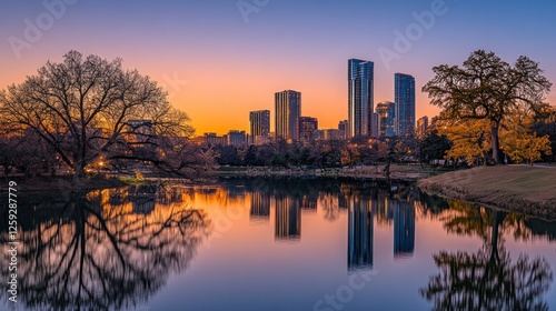 Fototapeta premium Sunset over city skyline reflecting in tranquil lake