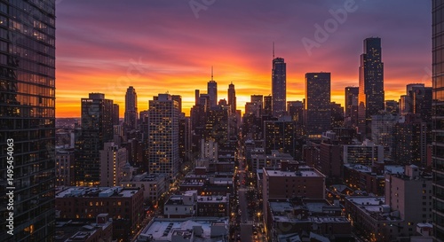 Obraz premium Sunset over city skyline with colorful clouds and skyscrapers