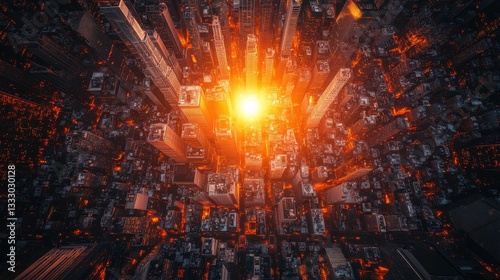 Fototapeta premium Sunset over city skyscrapers urban landscape aerial view vibrant atmosphere...