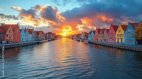 © Grameh, Obraz premium Sunset over Colorful Canal Houses in Bruges, Belgium