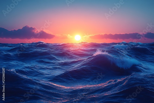 © Leo, Fototapeta premium Sunset Over Deep Blue Ocean Waves Rolling