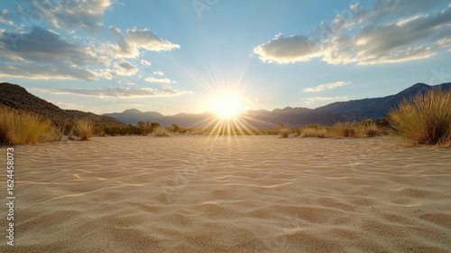 Fototapeta premium Sunset over desert landscape with golden sand and distant mountains, creating serene atmosphere