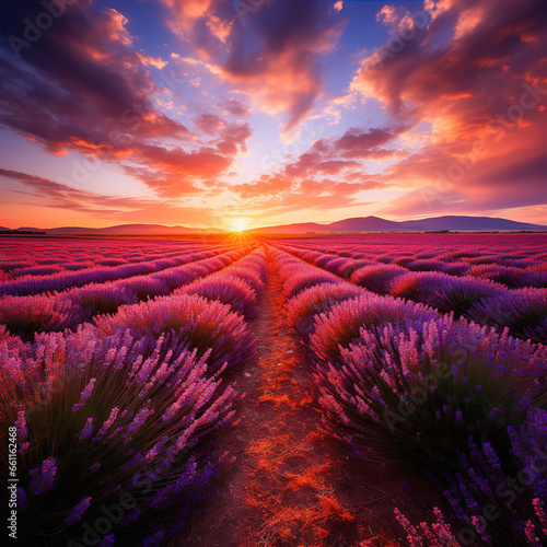 © Yevhen, Fototapeta premium Sunset over endless lavender fields. Created with Generative AI
