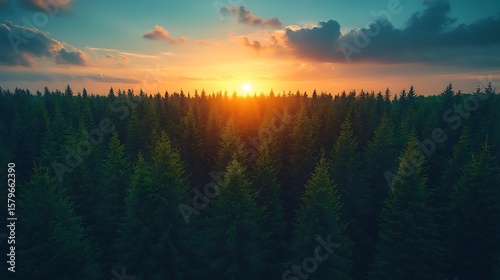Obraz premium Sunset over evergreen forest