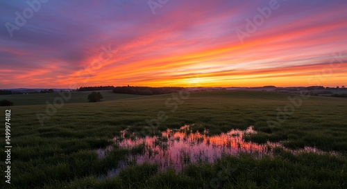 © Aufa, Obraz premium Sunset Over Field and Water Reflecting the Colorful Sky