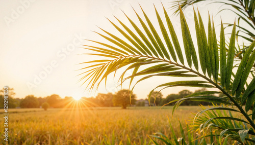 Fototapeta premium Sunset over field with palm leaves in foreground