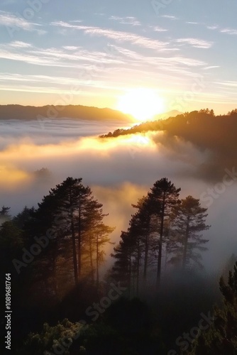 © Alexandr, Fototapeta premium Sunset over foggy mountains