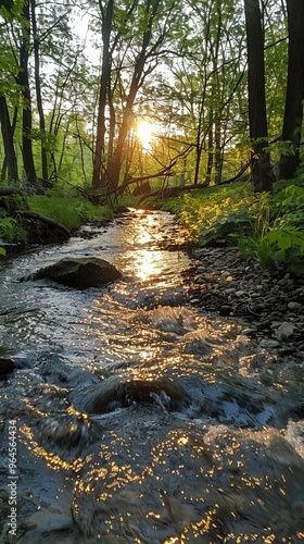 Obraz premium Sunset Over Forest Stream with Reflecting Light