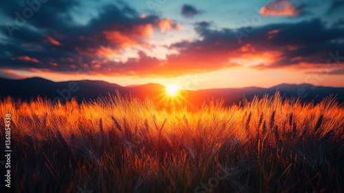 Fototapeta premium Sunset over golden wheat field with mountains behind