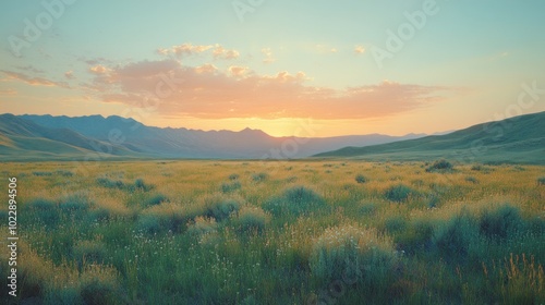 © hazia, Fototapeta premium Sunset Over Grassland and Mountains