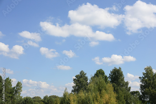 © Vladiko, Fototapeta premium sunset over green meadow and trees in cloudy sky