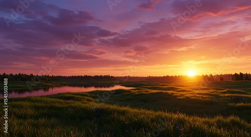 © NEUVANJOSE, Obraz premium Sunset Over Green Wetland Landscape Nature Scenery with River and Sky Dramatic Emotional Peaceful Environment Beautiful