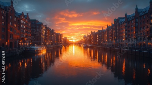 © BloomArt, Fototapeta premium Sunset over Hamburg canal reflecting buildings and boats
