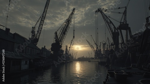 Fototapeta premium Sunset over harbor, industrial cranes, waterway, shipyard