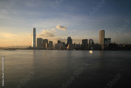 Obraz premium Sunset Over Hong Kong City Skyline with Reflective Water