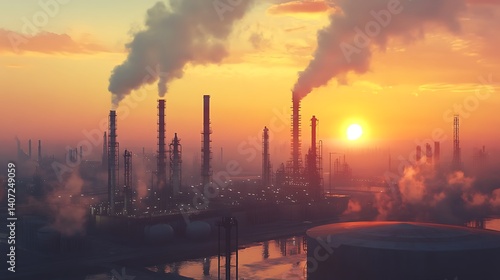 © zerogami, Obraz premium Sunset Over Industrial Complex: A Reflection on Energy and Environment