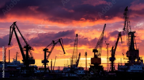 Fototapeta premium Sunset over industrial harbor with cranes silhouetted against vibrant sky at...