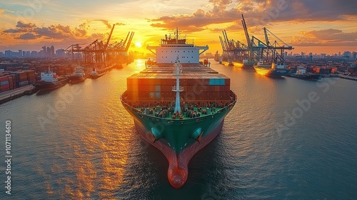 © izzuddin, Fototapeta premium Sunset Over Industrial Harbor with Docked Ship