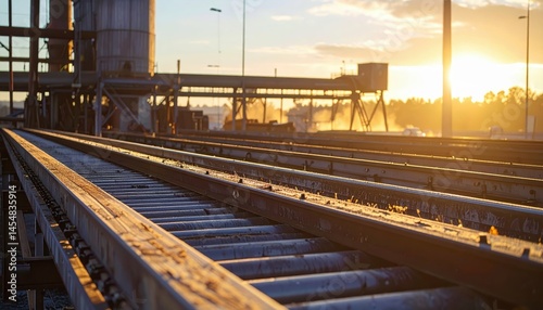 Fototapeta premium Sunset Over Industrial Railway Tracks with Equipment and Silhouettes