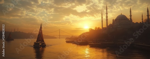Obraz premium Sunset over istanbul skyline with sailboats and suleymaniye mosque silhouette...