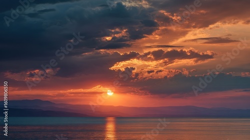 Fototapeta premium Sunset over lake with dramatic cloudscape