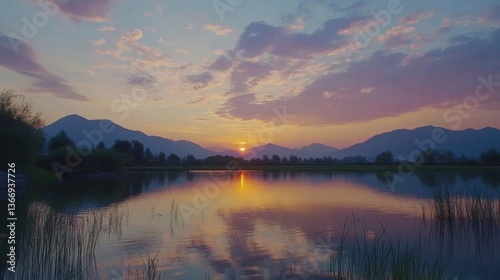 © 3d, Fototapeta premium Sunset Over Lake with Mountain Range and Clouds Reflecting in Calm Water