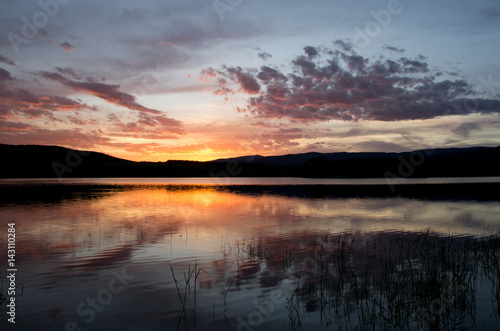 © Dave, Fototapeta premium Sunset over lake with reflection orange and purple