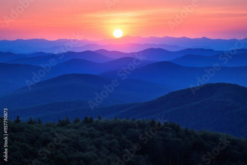 © Luminous Visions, Obraz premium Sunset over layered blue mountains, serene landscape.